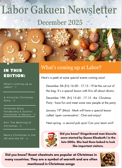 This is our 2025 Christmas newsletter. In this issue we have a Victorian Christmas story, Mark’s interesting article about the differences between Christmas in England and America, Kris’ story about when Christmas was banned in England, Justin’s Christmas in Mexico, and more! Enjoy reading it!