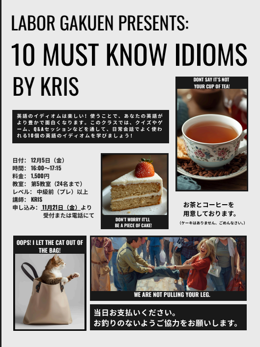 This December we had another special event with tea and coffee. This was with Kris and was about idioms. Kris had already ‘let the cat out of the bag’ (told the secret) so all our students knew about the class. Like the Pub Quiz in November, it was a popular event and the students had a great time. They could learn not just the meanings of some popular idioms, but also when and how to use them. Sounds like ‘my cup of tea’ (something I like). Of course, English is difficult, and there are literally thousands of idioms you could learn. In the end, you have to ‘wake up and smell the coffee’ (face the truth) and just try to learn the most common and useful ones. And that is exactly what students could do in Kris’ lesson – with tea and coffee!