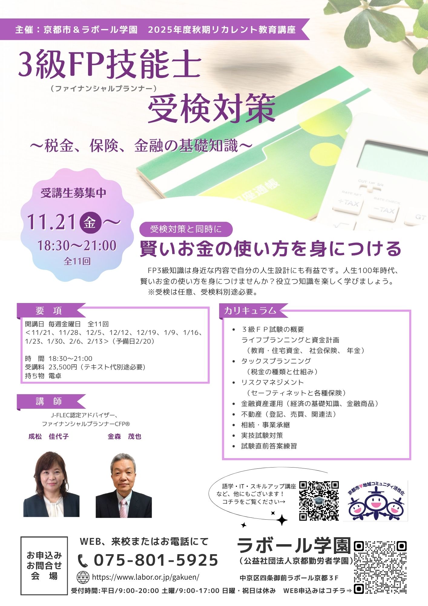 今求められる資格!3級FP受検対策講座、始まります この記事をSNSでシェア!“一生使えるお金の知識” を身につけよう #お金の勉強 は人生の必須科目。 税金・保険・投資・資産形成まで、この1講座で“暮らしに効く”知識がぜんぶ学べます。 「資格の勉強=難しい」ではなく、 生活に直結する内容だからすぐに役立つ! 副業・転職・起業を考える人にも人気の資格です。お申込みは、WEBか電話(075-801-5925)にて!中途からの受講も可能です。
