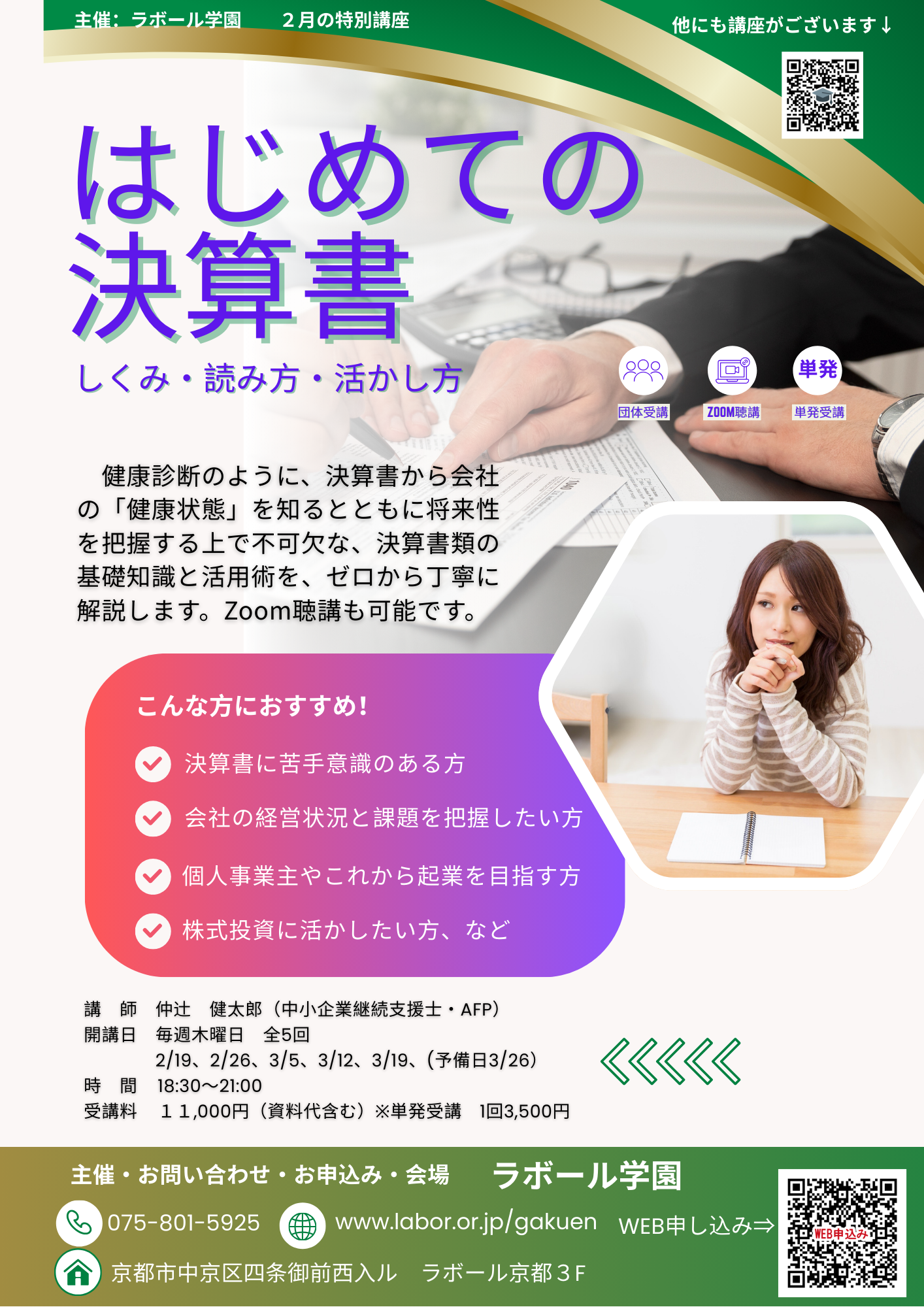 2月19日(木)から全5回で決算書のしくみと読み方、活かし方がわかる講座を開催します。